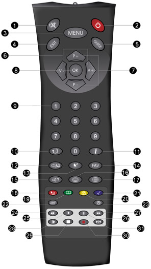 - Wählt den Sender und individuelle Menüoptionen direkt aus