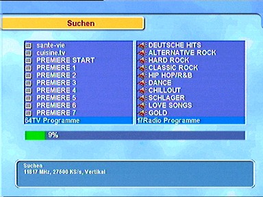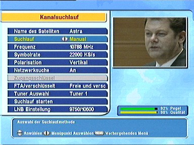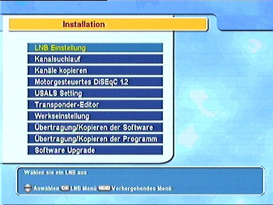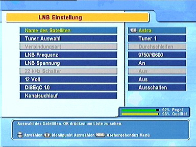 7.6.1.5. LNB SpannungWählen Sie hier aus, ob der Receiver das angeschlossene LNB mit Spannung versorgen soll oder nicht. Die Einstellung sollte bei direkter Verbindung des Receivers mit dem LNB immer "an" sein, wenn Sie einen Switch mit eigener Spannungsversorgung dazuwischengeschaltet haben richten Sie sich bitte nach den Angaben in der Anleitung des Switches. 7.6.1.6. 22kHz Wenn Sie ein 22kHz-Sat-Relais benützen, aktivieren Sie dieses hier. 7.6.1.7. 12VWenn Sie ein Sat-Relais mit 12V-Umschaltung verwenden, müssen Sie dieses hier einschalten. Die 12V liegen an der Cinch-Buchse an der Rückseite des Receivers an. Diese 12V sind fest mit dem Tuner 1 gekoppelt. Wenn die Tunereinstellung auf "Getrennt" steht und direkt nach dem Einschalten der Tuner 2 aktiv ist, ist die 12V-Schaltspannung so lange aus bis Tuner 1 aktiviert wird. 7.6.1.8. DiSEqC 1.0 Dieser PVR ist voll DiSEqC-kompatibel. Das erlaubt den Anschluß komplexer Sat-Anlagen mit mehreren LNBs/ Satelliten an den Receiver. Wenn Sie zwei oder mehr Satelliten gleichzeitig empfangen wollen, empfiehlt sich der Einsatz eines DiSEqC-Schalters. 7.6.1.9. Sendersuchlauf Um direkt aus der LNB-Einstellung einen Suchlauf zu starten, drücken Sie 7.6.2. Sendersuchlauf