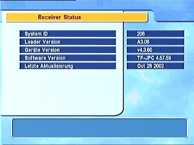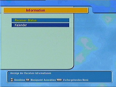 7.6.8. Übertragung der Software Diese Funktion wird benützt, um die Software dieses Gerätes auf einen anderen PVR zu übertragen, z. B. zum Aktualisieren. 7.6.9. Übertragung von Daten Mit dieser Funktion können Sie sämtliche Satelliten-und Transponderdaten auf einen weiteren PVR übertragen. Das ist z. B. dann sinnvoll, wenn Sie zwei oder mehrere dieser Geräte in einem Haushalt haben. 7.7. Information 7.7.1. Receiver Status