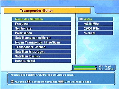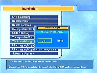 7.6.6. SAT/ TP Edit 7.6.6.1. Satellitenname Durch Drücken der Taste 7.6.6.2. Frequenz Wenn Sie hier die 7.6.6.3. SymbolrateAuf der rechten Seite des Menüs sehen Sie die Symbolraten, die zu dem jeweiligen Satelliten abgespeichert sind. 7.6.6.4. PolarisationWählen Sie hier die Polarisationsebene aus. 7.6.6.5. Satellitennamen editieren Hier ändern Sie den Namen des Satelliten. 7.6.6.6. Neuen Transponder hinzufügen Falls innerhalb eines Satellitensystems (wie z. Astra) ein neuer Transponder hinzukommt, können Sie diesen hier hinzufügen um die Sender auf dem neuen Transponder empfangen zu können. G. Transponder löschenIn diesem Menü können Sie vorhandene Transponderdaten löschen, wenn diese nicht mehr benötigt werden. 7.6.6.7. Satelliten hinzufügenWenn ein neuer Satellit seinen Dienst aufnimmt, können Sie diesen hier in die Satellitenliste nach der Eingabe des Namens aufnehmen. 7.6.6.8. Satelliten löschenFalls ein Satellit nicht mehr gebraucht wird, oder nicht mehr sendet, können Sie ihn hier aus der Liste löschen. 7.6.6.9. KanalsuchlaufVon hier aus gelangen Sie direkt, z. B. nach Eingabe eines neuen Satelliten, in das Suchlaufmenü. 7.6.7. Werkseinstellung