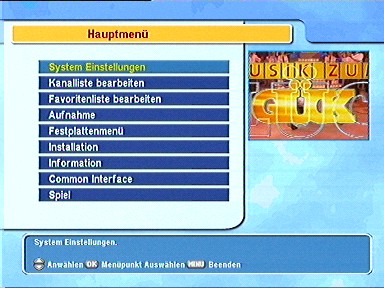 Falls Ihr Gerät noch nicht vollständig installiert wurde, dann sehen Sie bitte im Kapitel Installation/ Anschluß des PVR in dieser Anleitung nach. Viele der Funktionen und Einstellungen sind über das Hauptmenü erreichbar. Drücken Sie die Menü Taste um es zu öffnen, d. h. am Bildschirm sichtbar zu machen.