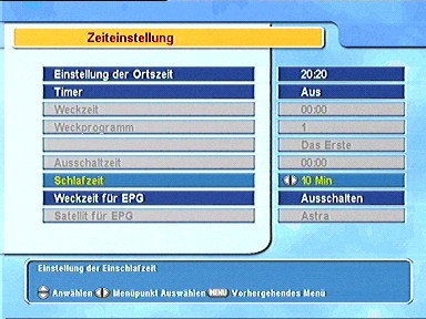 Die Sleep-Time ist hat eine ähnliche Funktion wie die Ausschaltzeit. Nur wird hier festgelegt, nach welcher abgelaufenen Zeit der PVR sich ausschalten soll, während mit der Ausschaltzeit ein bestimmter Zeitpunkt festgelegt wird.